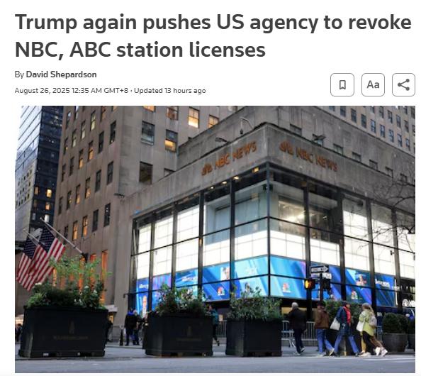 8月26日电(记者 宫宏宇)据道透社报导,好邦首脑特朗普当前再次催促好邦联国通讯委员会(FCC)撤消迪士僧旗停ABC战康卡斯特旗停NBC消息二家好邦播送电瞅公司派司。 特朗普24日早间正在酬酢媒介上显露,那二家消息机构生活私见,大都对于他原人的报导皆是“反面讯息”。特朗普宣称,“许多人以为它们应当被撤消派司,尔实足援救那个见识,原因他们充溢私见且没有老实。”